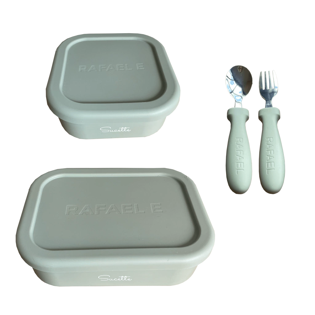 El combo inlcuye: 1 lunch box personalizada, 1 lunch box mini personalizada, 1 set de cubiertos (cuchara y tenedor) personalizados.