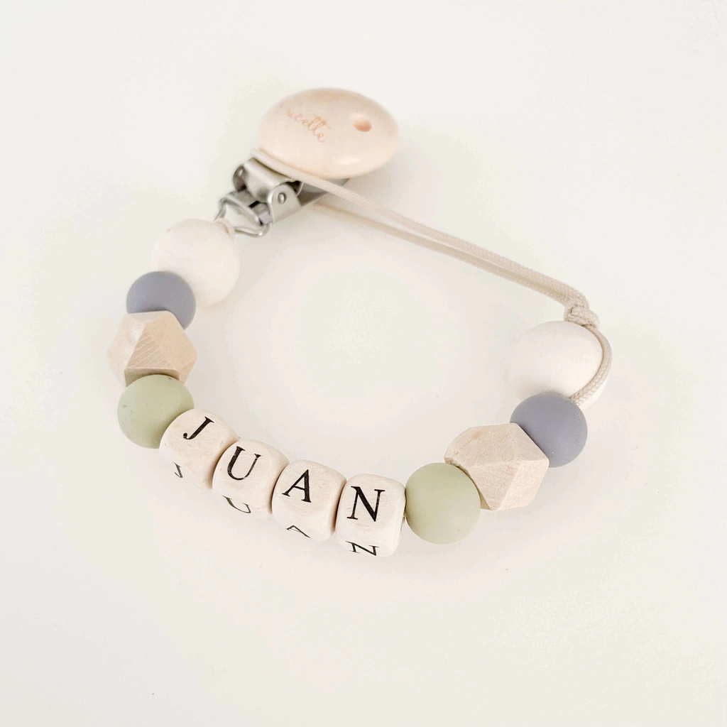 Los porta chupetes se confeccionan con cuentas de madera natural sin tratar y cuentas de color en silicona orgánica antibacteriana de grado alimenticio y libre de BPA, PVC y Ftalafato. El broche en madera cuenta con un sistema tipo cocodrilo metálico, recubierto con un tope plástico para no dañar la ropa. Son 100% no tóxicos.
