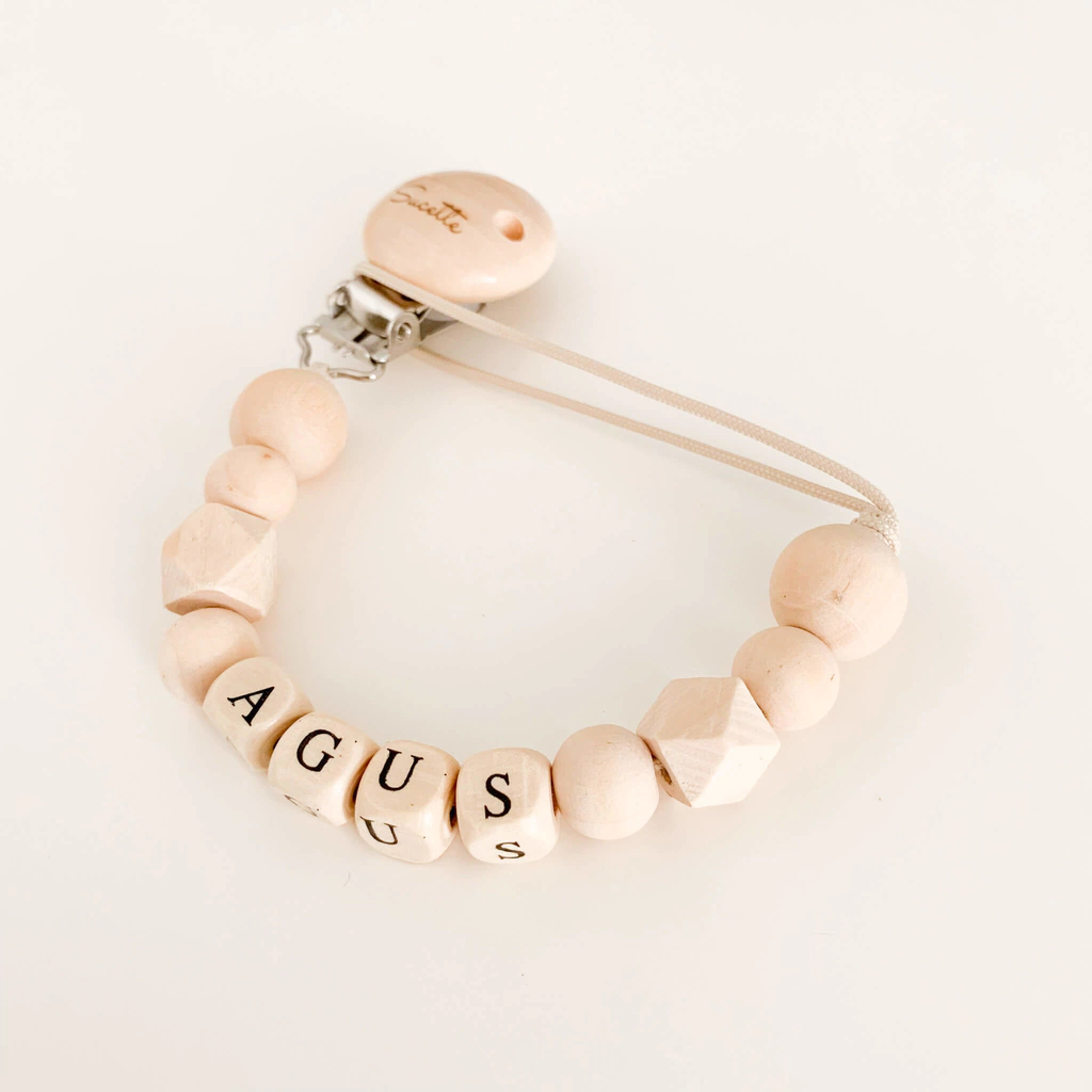 Los porta chupetes se confeccionan con cuentas de madera natural sin tratar. El broche en madera cuenta con un sistema tipo cocodrilo metálico, recubierto con un tope plástico para no dañar la ropa. Son 100% no tóxicos.